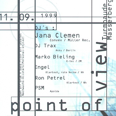 Nichts ist schwieriger als in unserer Region -sprich Südthüringen- der obere Wald = Masserberg etwas Partymäßiges zu organisieren! Trotzdem haben wir, ein kleines Team von ein paar Leuten aus dem südthüringischem Gebiet mit dem Namen Organisation zur Erhaltung moderner Tanzkultur es uns zur Aufgabe gemacht, in diesem Bereich aktiv zu werden. Clubs und Dissen haben Sommerpause oder sucken, gute Partys sind zu selten und oft zu weit weg. Also haben wir nicht lange gefackelt und selber zum wiederholten Male was auf die Beine gestellt, aber diesmal im größerem Stil. Also: unser zweites Baby heißt offiziell point of view und wird am 11.09. in der Turmbaude zu Masserberg das Licht der Partywelt erblicken. Nachdem die erste unserer Partys am 07.05. in Schnett ein voller Erfolg war, fehlte es uns nicht an Ansporn es nochmal wissen zu wollen. Doch ab hier begannen die Probleme: Location finden, DJ´s booken, Anmeldungen, Behörden, Blah... Fakt ist: es scheint Niemand Interesse zu haben, die Jugend mal ´n bischen zu unterstützen, im Gegenteil, es wird alles versucht sämtliche Veranstaltungen zu verhindern. Doch Aufgeben is nich, und so haben wir unter großen Bemühungen doch noch eine der coolsten Locations in unserer Gegend gefunden. In 841 Metern Höhe steht er: der 40 Meter hohe Masserberger Aussichtsturm. Wer sich am 11.09. dort einfindet wird es garantiert nicht bereuen, da wir nicht zuletzt DJ-mäßig richtig gut zugelangt haben (siehe Flyer).Wer´s doch verpassen sollte kann sich danach als kleinen Trost unseren Party-review mit reichlich Bild-stuff reinziehen, don´t forget: nach der Party ist vor der Party... see you there...Christian&Uli 11.09.1999, 22 Uhr ... die Sonne verdunkelt sich ... die Blumen schließen ihre Kelche... Wind kommt auf ... die Vögel verstummen ... der Bass setzt ein ... Yes, Sonnenfinsterniss war gestern, jetzt gibt´s Party, aber richtig phatt !!! Denn an besagten Samstag werden einige der besten regionalen und überregionalen DJ´s den Rennsteig zum beben bringen. Wir befinden uns in Masserberg´s beliebtem Ausflugsziel, der Turmbaude, und vor Ort werden sein: die von allen gekannt und verehrte Jana Clemen, der nicht nur in Südthüringen geschätzt und befeierte Marko Bieling, die ziemlich guten, berühmt und berüchtigten Neuhäuser Engel und Ron Petrel, DJ Trax aus Berlin, PSM aus Apolda, der Steve aus Gotha...genug Auswahl an Mucke, so das an manchen Stellen auch mal flockiger House oder live performter Elektro zu Gehör kommt! Für richtig fette drum´n bassige Sounds sorgen unsere Nachwux-Allstars wie z. B. der Christoph (Eisfeld), der Patrik (Eisfeld) oder der Christoph (HBN). Coole Leute, krasser Sound & ´ne special Deko werden diesen Abend zu einem unvergesslichen, in Masserberg noch nicht dagewesenen Event machen! Lassen wir gemeinsam den Sommer ausklingen, trotzdem mit einer überdachten Open-Air-Terrasse ... Vorsorge ist alles! Be there !