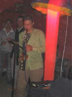 Niclas am Saxofon auf dem Housefloor. In dem liebevoll